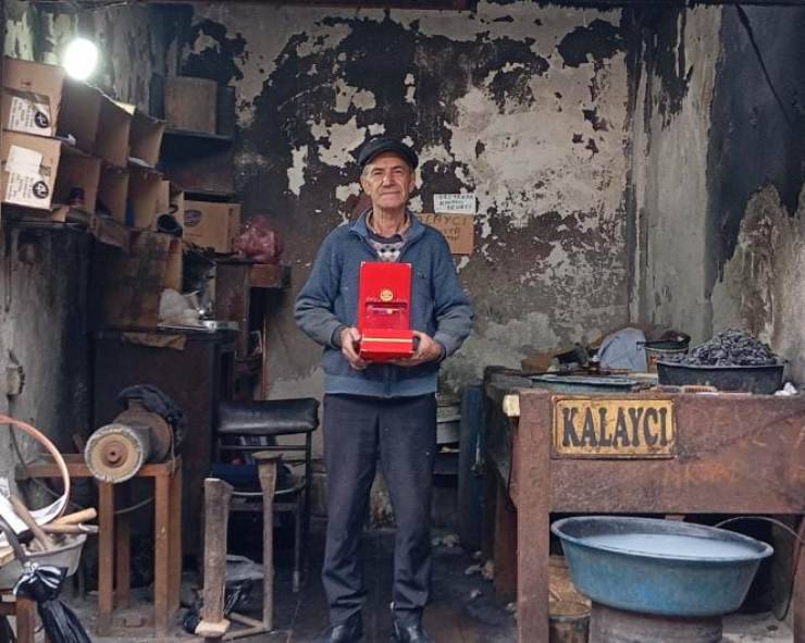 Adana’da 4 Kuşaktan Beri Aileden Gelme Kalayacılık Mesleğini, Adana Büyük Saat Kazancılar Çarşısında Büyük Bir Hassasiyet ve Titizlikle Yapan, Köklü Deveci Ailesinin Önemli Bireyi, 67 Yaşında ki, Bulunduğu Semtin Sevilen Sayılan Popüler Esnafı Kozanlı Hulusi DEVECİ’ye Unutulmaya Yüz Tutan Mesleğine Verdiği Kalite,Dürüstlük ve Ustalık Nedeniyle;